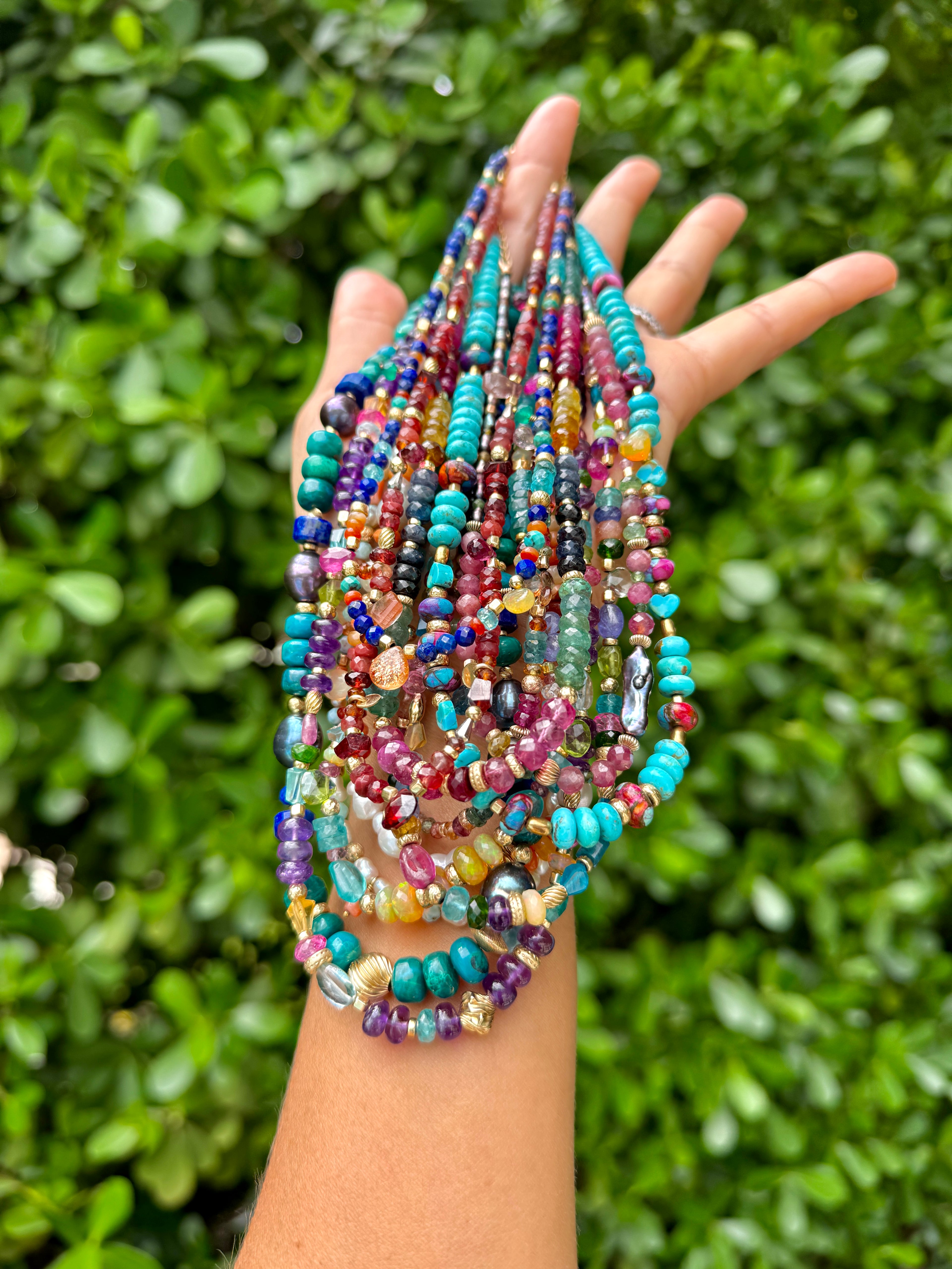 Our Gemfetti collection is a demi fine collection that was carefully curated to include vibrant and bold top quality gemstones including African amethyst, electric blue apatite, bright pink topaz, aquamarine, rubies, tanzanite, opals and a cornucopia more. As with all our collections, there is a very limited quantity of pieces. Make sure you snag your beaded gemstone necklace today- once our pieces sell, they are retired.