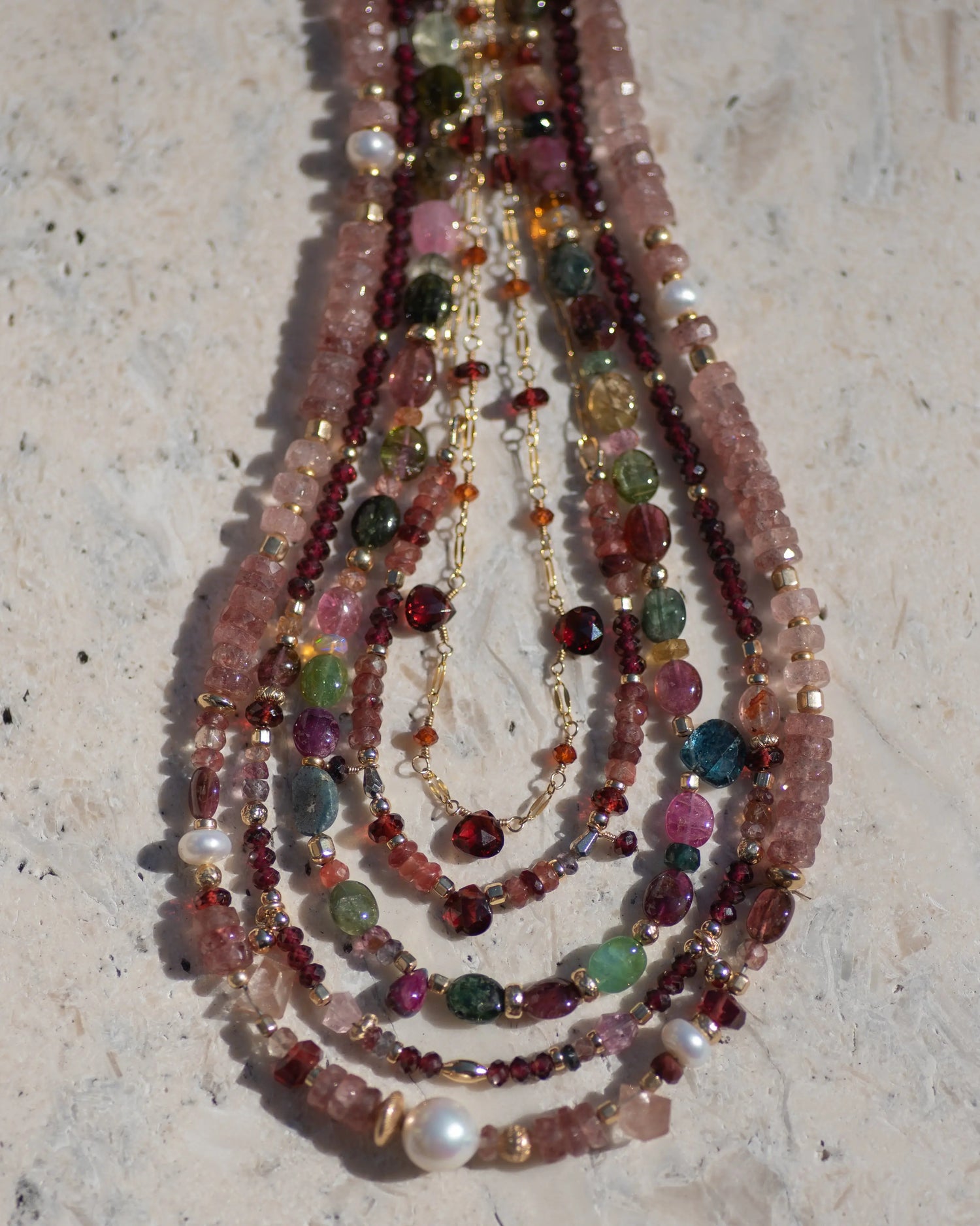 A stunning collection featuring an array of burgundy hued gemstones. From tourmalines to garnet to strawberry quartz, there are a range of stunning gemstones all made to easily layer together. Only a few remain of each design.