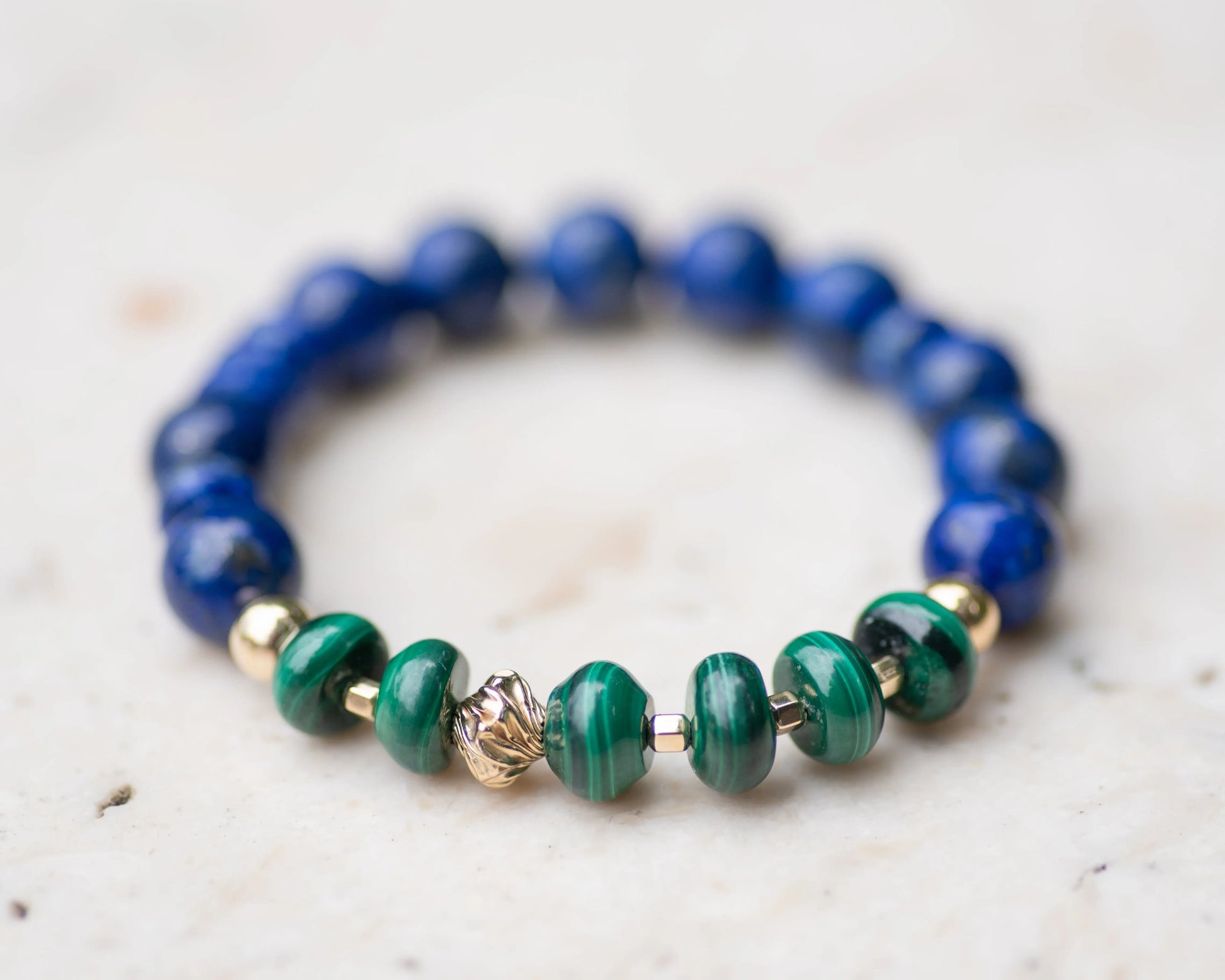 The Lapis Lazuli Bracelet combines the deep blue hues of lapis lazuli and the vibrant shades of malachite, creating a stylish accessory that stands out. Each bead is carefully selected to make it an eye-catching piece for any outfit. All gemstones are genuine and undyed.
