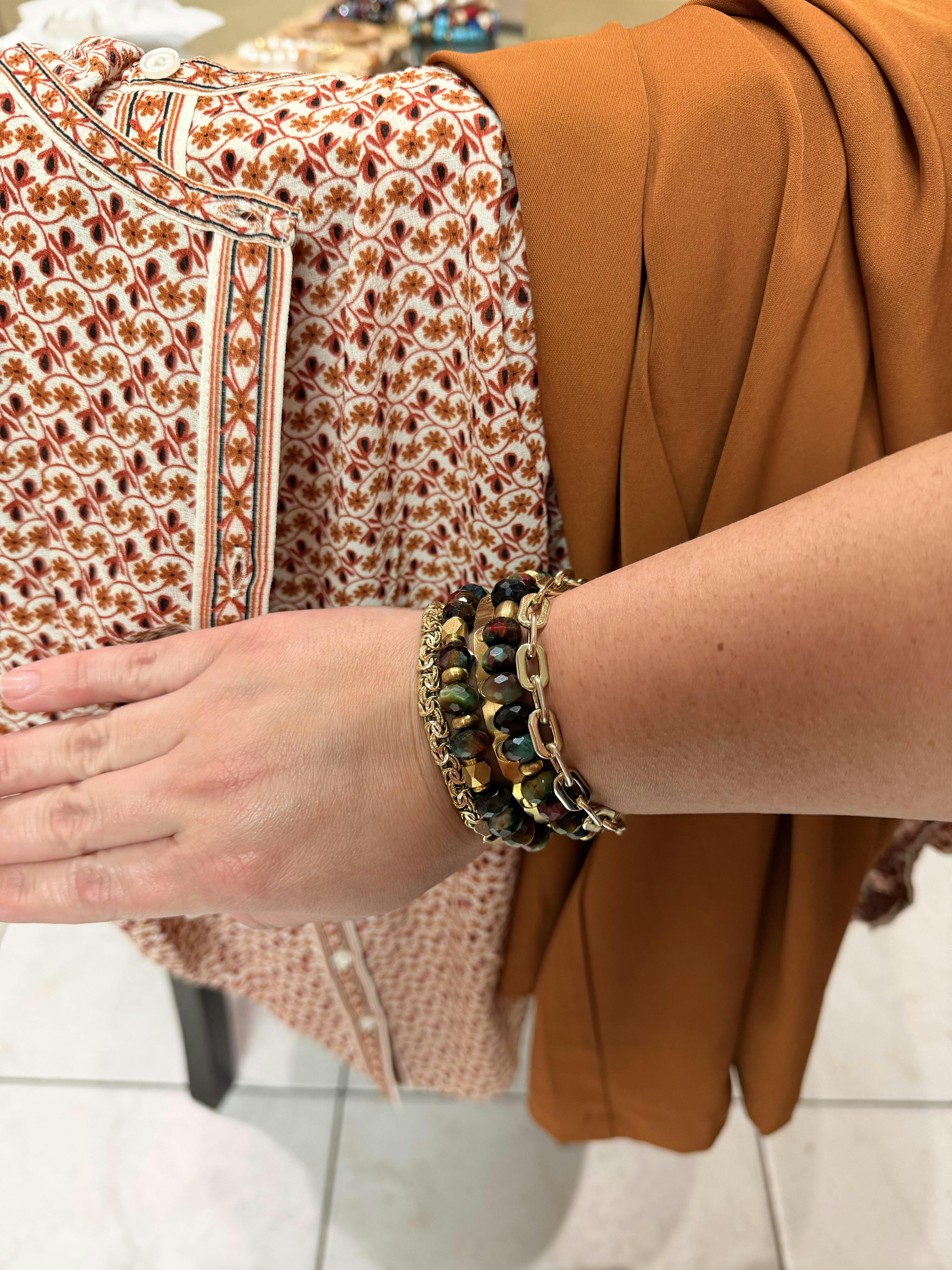 A stunning multi colored tiger'e eye bracelet which can easily be worn year round. This faceted tiger's eye has been color treated however, the color will not run or fade. It has a variety of hues which make it one that can easily be mixed into any stack. There are brass accents as well which pick up those warm golden tones.