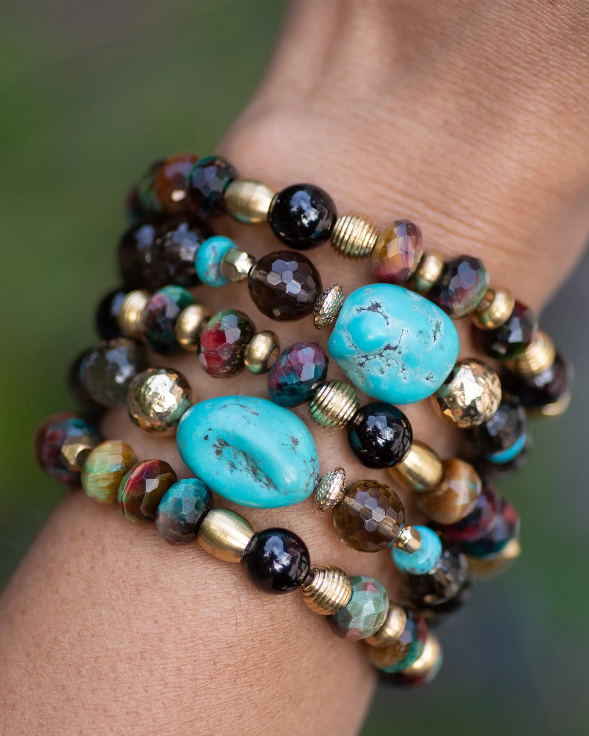 This turquoise and smoky quartz bracelet makes a stunning statement for your wrist. It features a chunky genuine turquoise nugget with faceted smoky quartz beads and turquoise accents. There are gold filled accents throughout as well. It is shown paired with our rutilated quartz and smoky quartz bracelet. It is the perfect statement piece to wear this winter.