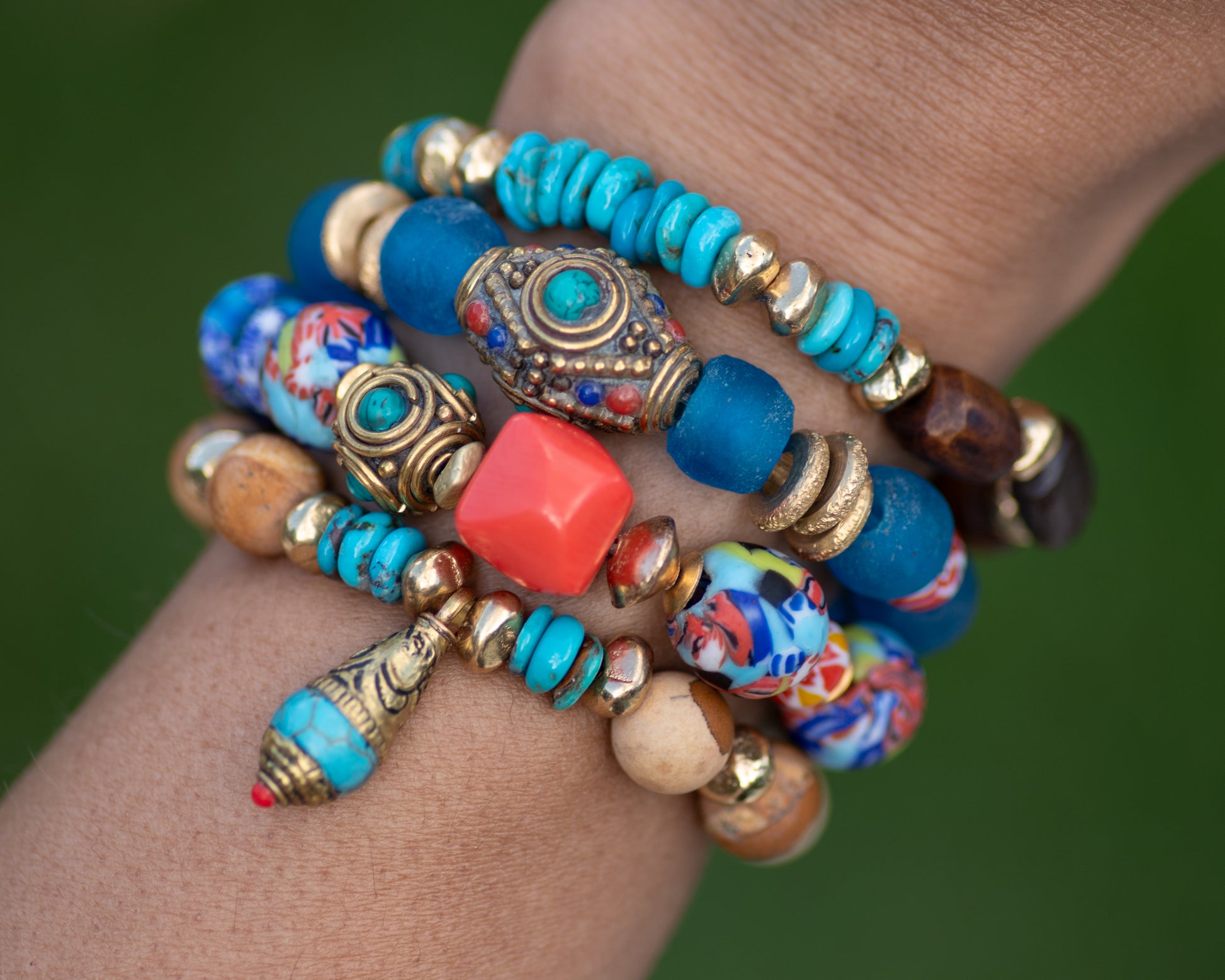 This genuine turquoise and bone beaded bracelet is the perfect little bracelet to easily add some color and texture to your stack. The design is kept simple so it can easily mix with a variety of styles. There are brass accents throughout that bring that golden warmth. It is shown styled in various ways. Some of these pieces are available online and others are from past collections.